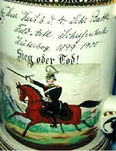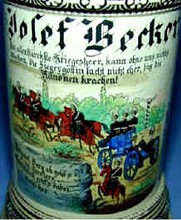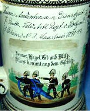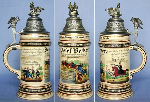 and Lehr Regt. Field Artillery Gunnery School Jüterbog 1899-1900 Kannondonner ist unser Gruss...Cannon thunder is our greeting. Double-unit regimental steins are very scarce and uncommon. In 1898 Josef Becker began his service in the Imperial Army as a member of the 7th Battery of the Field Artillery Regiment "von. Holzendorff" (1st Rhenish) Nr. 8 garrisoned in Saarlouis. Becker must have distinguished himself because for his second year of service he was selected for assignment to the Field Artillery Gunnery School as a member of the 4th Instructional Battery of the Field Artillery Schiessschule in Jüterbog. Becker would have placed the order for this stein while serving in Jüterbog, before leaving his active military career for the Landsturm, or reserves. The absence of a roster on this stein is quite natural. Normal practice would be to list all the members of Becker's original regiment. These lists were printed and applied as transfers, and undoubtedly many of the members of Becker's original regiment in Saarlouis had such transfers applied to their steins. Therein lies the rub - Becker, near Berlin, was miles away from the transfers which were prepared for his original unit in Saarlouis, near the western border between Germany and France. The pottery stein, marked on the base and manufactured by Merkelbach & Wick, shows three scenes (see below): four gunners engaged in a crew drill, a horse-drawn gun and limber going up an incline, and a mounted artilleryman with raised sword. The lid includes two artillerymen manning their cannon, and a crowned and spread-winged eagle thumblift. |