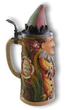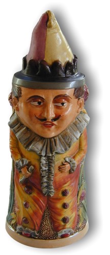 The Diesinger character steins, as exemplified by the clown seen to the right, are colorful and whimsical. Unlike many other character steins, they make little reference to drinking habits or culture, city towers, historical or religious figures, bowling or hunting. They base their appeal on lovable faces - the entertaining clowns of a circus, the neighbor holding his cat or strolling with his umbrella in hand, the butcher from the shop on the corner. They require no special explanation, they simply offer amusement.