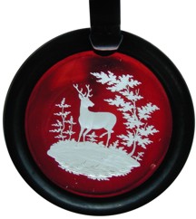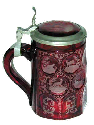 This colorful glass stein is actually made of clear glass which has been coated with a ruby stain which was then cut away to show the design. It provides a nice lesson in the techniques of cutting and decorating glass.