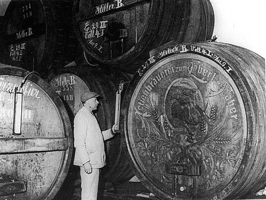 Below, the Kellermeister checks on the status of a huge barrel from Aktienbrauerei zum Eberl-Faber, circa 1935. Would the carved end of the barrel add to the decoration of your bar? And just imagine having this barrel full of beer in your Keller. You would probably never have to buy any more!