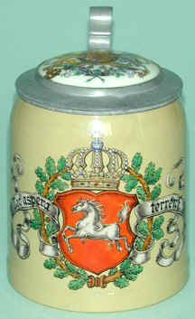 identifying the firm which decorated the stein.. At first glance Mettlach collectors might find this stein somewhat "suspicious". The contrast between the tan body and the bright white of the porcelain insert is a little bit off-putting, and while the coat of arms on the body looks sufficiently "Germanic", the arms on the inlay are quite different, and they look more like an English royal design. All in all, what are we to make of this? Let's see what we can learn from the clues on the stein. A Google search of the internet for the words "white horse red shield" returns almost 5 million hits, but the ones at the top of the list are the only ones we will need. The sixth site in the list of links is for the Kingdom of Hannover (see Reference below), a promising alignment with the inscription and the location of the decorating firm. In fact, we quickly learn that the white horse and red shield have been widely used for centuries as civic arms in northern Germany, including Braunschweig, Hannover and Oldenburg. Hannover was chartered as a city in 1241, although the settlement existed as early as 1100. In the 14th century the city was fortified with a solid city wall, and was an important member of the Hanseatic League. From 1636 it was the capital of the Dukes of Braunschweig-Lüneburg. In 1692 Ernest August was made an Elector by Emperor Leopold, and by marriage he linked the Hannover and Stuart families. Upon his death the title Elector of Hannover passed to his eldest son George. The Electorate was elevated to a kingdom in 1814 as a result of the German conflict with Napoleon, whereby George III became King of both England and Hannover. In 1837 the two thrones were separated as a result of Salic law which prevented a woman from succeeding to the crown of Hannover. Hannover continued as a kingdom until 1866 when it was annexed by Prussia in the Treaty of Prague, and made into a province, with the city of Hannover as its capital. The province gave up its individuality again in 1916 when it was united with Oldenburg, Brunswick and Schaumburg-Lippe as the modern state of Niedersachsen (Lower Saxony). With this information to channel our research, it is quite easily determined that the coat of arms on the inlay are the royal arms adopted by George III, who was simultaneously King of England (from 1760) and Hannover (from 1814). They are described as "the arms of the United Kingdom surmounted with the three-fold escutcheon of Brunswick, Lüneburg and Hannover, with over all the crown of Charlemagne witnessing to the electoral dignity." So, all the pieces dovetail together. This stein, which was proudly presented to Louis Otte in 1915, displays the civic and royal arms of the province of Hannover. References: