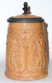 The I.H.Krebs factory of Valendar and Höhr was founded in 1841. Among other things, they manufactured "gepresste Kännchen," or so-called "Regensburg" steins, and may have been the first to do so. Unlike the other factories that manufactured these steins, Krebs applied nicely stylized handles. I have four Krebs pieces and each