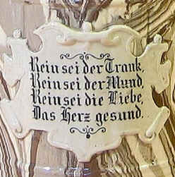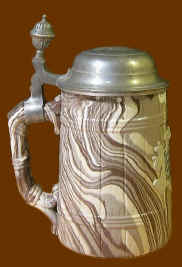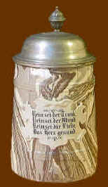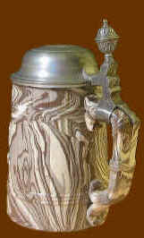 This interesting - and, yes, curious - stein was made in a popular barrel form using clays of varying colors which had been swirled together before the stein was molded. The body is formed to give the appearance of vertical barrel staves horizontally bound with reeds (withes). The swirled colors in the clay give it the appearance of wood. This same technique was used on some early barrel steins (form 675) from Mettlach. The contrast in clay colors on this stein is fairly unusual. The central cartouche contains an appropriate verse for friends spending a night drinking.