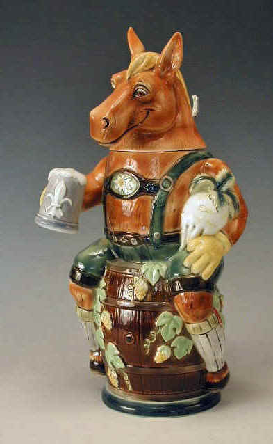 character stein of a thoroughbred horse sitting atop a keg of beer,