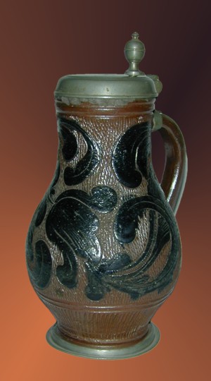 The stein seen here was made in Muskau, in the Lusatian region of Germany, circa 1700. The body shows an incised floral design which has also been