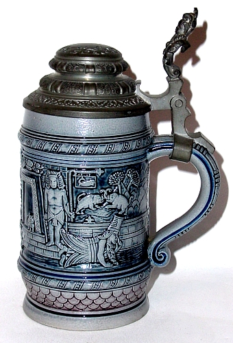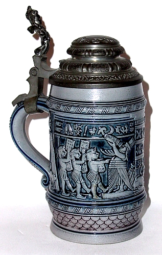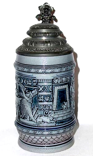 produced at least one stein on the subject in blue & gray saltglaze. It is model number 488 and the only one listed in their catalog, so I must assume there were no others depicting the rest of the poem. Their's is done in a comedic style that