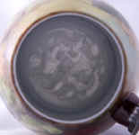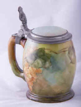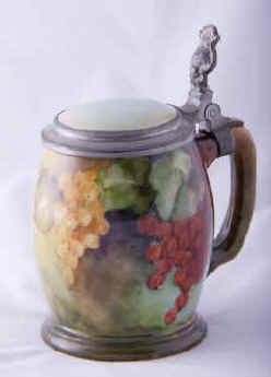 ![]() The grapes are a highly unusual decoration for a German beer stein; much more appropriate for drinking wine! It includes a lithophane of a seated man playing a zither for two women. The five-ring hinge tells us that it was made about 1900 or so. No manufacturer's mark, nor is there a capacity mark, leading me to speculate that this may be a "one of a kind." |