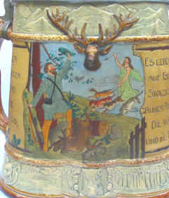 appears to be designed as the perfect gift for an avid hunter.The scene on the stein, shown unfolded at the right, depicts a successful hunter, rifle in one hand, his
