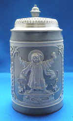 | Beer drinking is generally thought to be associated with Bavaria, the Southeastern province of Germany. Its capital city is München (Munich) which hosts the famous annual Oktoberfest. The city’s name, München, comes from the word “Mönche” meaning monks, reflecting the fact that Benedictine Monks established themselves here in the 8th century. If one stands in the Marienplatz in front of the Rathaus (town hall) in Munich and looks up at the Glockenspiel (clock play which happens every hour) and keeps looking up to the top of the tower, then barely visible standing on the top is the figure of the “Münchener Kindl” (Munich Child) symbol of the city. This is the figure on the front of the featured stein of the month. The side to the right of the handle shows the “Hofbrauhaus” (court brew house) site for much of the Oktoberfest activities. The other side shows the female figure of Bavaria with a lion at her side symbolizing Bavaria. | ||||||