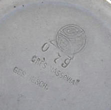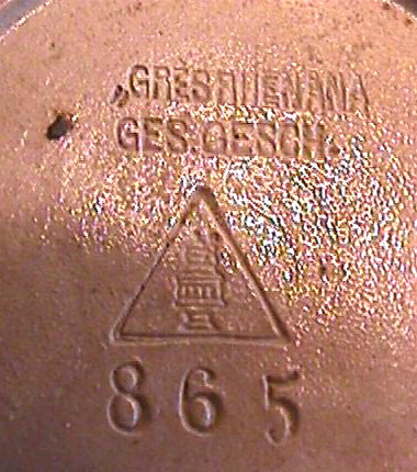 | The Münchener Kindl is a popular theme for very many beer steins including many character steins. However the stein shown here has some other interesting features. One such feature is the unusual light and dark gray color rarely encountered on steins. The mark on the base of the stein (figure 1) is unusual for two reasons: first the mark of Simon Peter Gerz barely detectable with the 079 and GRÈSNASSOVIA meaning Nassau Stoneware and referring to this unusual color technique; second is the overmark of the finishing shop of Jakob Goldschmidt that ordered the stein from the Gerz factory and asked for their mark to be applied at the factory. For a more complete discussion read John McGregor's article at the stein college web site (ref 1). The mark on the base of a similar Gerz stein (figure 2) is also shown for comparison and has the early “stein in triangle” mark which was over struck in the first example, 865, GRÈSRHENANA meaning Rhenish Stoneware and GES. GESCH. (Gesetzlich Geschützt) meaning patented or copyrighted. For a further identification of this and many other marks check out Chris Wheeler's web site (ref 2) on stein marks. Thanks also to Prosit Editor Walt Vogdes for his input on this subject. |