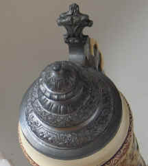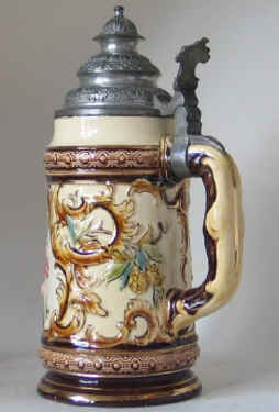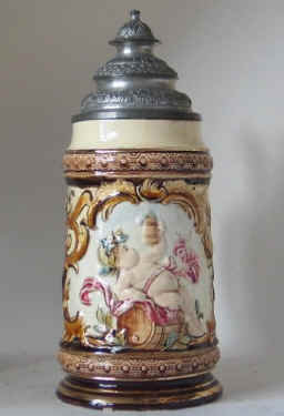 R.Ditmar Majolica steins have a look all of their own. They are made of earthenware with an opaque tin glaze which covers the entire body. They come in both colored glazed relief and over-the-glaze transfers. This stein is made with a multi-colored glaze and depicts a relief decoration of baby Bacchus laying on a beer barrel tasting a brew. For more information on the Rudolf Ditmar and his Majolica steins, there is an excellent article by Ron Fox in the March 2006 issue of Prosit. |