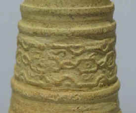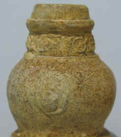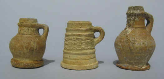 Imagine my elation when I unwrapped these little gems and saw how impressive they really were. They were tiny, the Bartmankrug is only 2” tall and the other two about 1 ½”. The detail was phenomenal ( see the close-ups below ) and they looked old — I mean, really old! They were unglazed but I felt that they had been fired at a pretty high temperature: they were “rugged”, not like “soft” pottery. They were not hollow like a container would be so they obviously were not intended to contain liquids. There were no marks anywhere. Upon studying them some more, I realized that they were not molded, but hand-thrown! How did the potter get such clear detail in the design? How did he make it? Did he have a tiny potter’s wheel? He must have had special tools just to make them. But what was their purpose???? Salesman’s samples? Models for new designs? What?