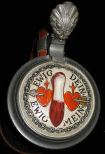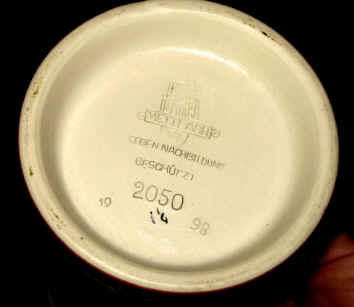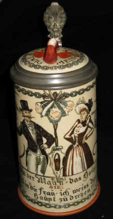 ![]() “Er: Ich bin der Mann; das Hauptling!” (He: I am the husband; the head!) “Sie: Ich bin die Frau; ich weiß das Haupt zu drehen!!” (She: I am the wife; I know how to turn heads!!) The slipper can be seen between the couple on the front of the stein and also on the lid with the text: “Ewig dein” (forever thine) and “Ewig mein” (forever mine). The "slipper" represents the woman's primary means of maintaining her dominance in the marriage. It's a common theme in German lore. Note the symbolism of the chains and the babies. The base markings show that this “etched” or “incised” Mettlach stein was made in 1898, evidenced by the “98" to the lower right of the mold number “2050" before it appeared in the 1899 catalog. The impressed castle mark with Mettlach and VB for Villeroy & Boch was used on premium Mettlach items from about 1883 to 1905 and beyond. The legend in the middle reading “Gegen Nachbildung Geschützt” means legally protected against copying or copyrighted. |