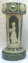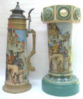 The form 2649 Die Kannenberg Beer Tap pictured was made in 1910. By 1916, however, the design on the tap had changed from the etched Die Kannenburg design to a relief design of a gentleman in a top hat, and formal coat with a rather lascivious smile holding a stein in one hand and a radish in the other (front) and 2 woman serving 5 liter mugs of beer (to the right of the main figure) and a roasted bird on a tray (to the left of the center design). The three people shown on the newer design are separated by columns with a serving stein pictured in the top and base of each. The rear panel, which would be facing the bar tender, is left blank. Apparently they felt that the bar tender had no need to be entertained by the design. The designs in the upper band where the holes for the tap are located and the base are identical in every way except coloring. The vivid colors of the Die Kannenburg tap are missing from the later design. Based on the year of manufacture, it is likely that cost played a role in changing the design. However, why not change the form number? I guess, like the steins where the form number was changed, we will never have the answer. |
