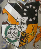 The Wappen can be interpreted as follows, starting in the upper left quadrant and going around clockwise: 1 - the association colors. 2 - stars symbolizing the nine founders of the Corps. 3 - the Prussian eagle, an indication of the former affiliation of this region to Prussia; four stones from the Stental city crest; the key from the city crest of Salzwedel. (Stental and Salzwedel are two cities in the Sachsen-Anhalt.) 4 - an oak wreath symbolizing the Corps community; crossed swords indicating that this is a dueling society; the founding date of the Corps, Oct 28, 1844. The identifying cipher of the association, or Zirkel, is shown in the center shield. The German Student Associations are an interesting field of study, but it is not my intent in this article to say much about them. For those interested in learning more, there are several excellent articles available in the library on this web site. A good place to start would be the January 2005 Stein of the Month article by Ron Gray.