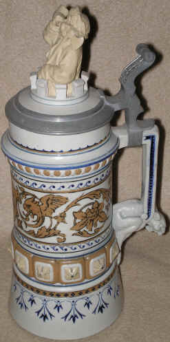 | Like many of us, when I started collecting, Mettlach steins were the holy grail of wares. As I graduated through my collecting experience, Mettlachs became the pinnacle of my collecting aspirations. After circulating hundreds of them through my collection, they are no longer the focus of my collecting these days. However, I still hold a number of these pieces as no one can argue that they are some of the finest pottery steins. Mettlach 1069 is no exception. In fact, this stein has everything I love about Mettlach wares, as well as having a few unique features. Although I’m not sure the stein really has a central motif or theme, it really does have some great qualities. Rather than try to describe these things in a loosely constructive narrative, a list of features may work better. 1. The “geometric” pattern around the body of the stein is very attractiveI could probably list more about the great features of this piece, but it really speaks for itself. This piece doesn’t come up for sale too often, and I count myself fortunate to have found one. It is certainly a unique Mettlach ware, and would fit well in any collection.