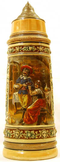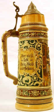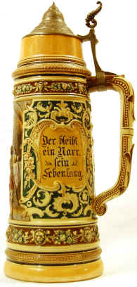 The inscription on the stein is a saying that I have always smilingly enjoyed: Wer nicht liebt Wein, Weib, Gesang, Who does not love wine, women and song, der bleibt ein Narr sein Leben lang. Remains a fool his whole life long. Unfortunately, in this case the appropriate follow-up verse, "Yet who doesn’t love a good glass of beer is much dumber, it seems to me", is missing from this stein, but I still had to have it. ![]() On the next morning—the very next morning—I opened SteinTalk as usual, and discovered a discussion about “TP” marked steins! I had noticed the article on "TP" steins in the Reading Room, but had never read it. It hadn’t applied to me, until now. After carefully reading “The Elusive ‘TP’ Mark”, I discovered that the actual manufacturer of this beautiful stein was Johann Peter Thewalt. |