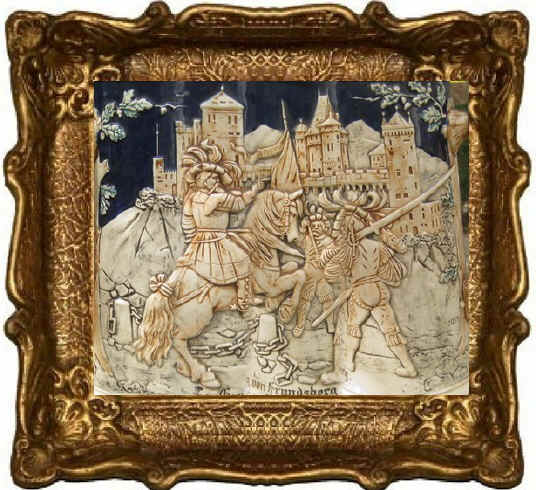 There is really nothing remarkable about this stein, and that is one of the reasons I wanted to feature it. It is a nice stein, with very detailed relief work encompassing the entire body of the stein. To fully appreciate the art work, one has to look at it "un-rolled". As one can see in the picture below, it would make a nice picture to frame and hang on one's den wall. There is an interesting aspect to this stein. Several years ago it was the subject of an extended discussion on Steintalk. The original poster wondered why this non-descript stein was generating so much activity on eBay. One poster went so far as to say that "this stein, read "piece of junk", would not rest on a true collector's shelf." It turned out that it was the subject matter of this stein, not the stein itself that made this stein so desirable. This stein is a great example of what makes stein collecting such an interesting hobby. There is a stein for everyone. A collector can build a satisfying collection of steins without chasing after regimentals, Mettlachs, or other rare and hard to come by steins. Note: For those interested, the full Steintalk discussion on this stein can be found HERE. Addendum: Lyn Ayers adds that the JW Remy Modell Buch lists model #1039 as a “1/2L Seidel hollow base, relief, Georg Frundsberg.” Price of 16 (probably Reichsmarks). |