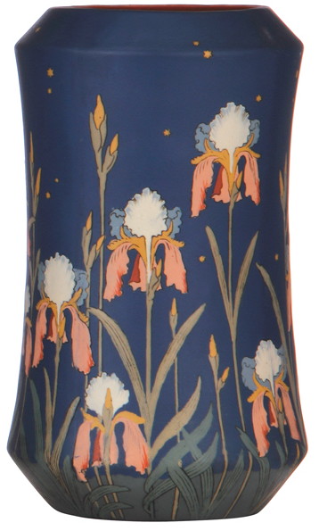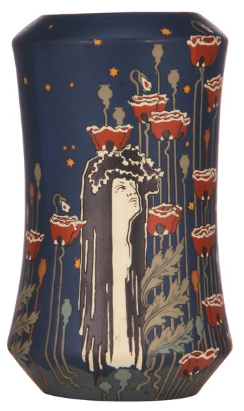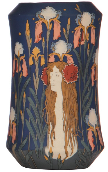 | Recently the Robert D. & Colette D. Wilson Mettlach Collection at the American Museum of Ceramic Art (AMOCA) in Pomona, CA has acquired two important vases attributed to Hans Christiansen. These vases are labeled "die Nacht" (the night) and "der Tag" (the day) and are Mettlach numbers 2424 and 2425 and were produced in the famous chromolith or etched process. They were dated 1898 and shown in the 1899 Mettlach catalog. The design for die Nacht was published in Jugend magazine number 23, 1897 and it's therefore probable that the vases were not actually designed by Christiansen, but his designs were adapted by Mettlach artists. We'll probably never know. Neither the vases nor the original print in Jugend magazine had his logo or signature which seems to be the case with many of his works except the paintings. | |