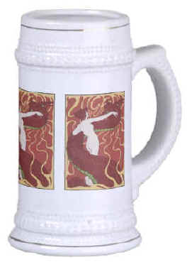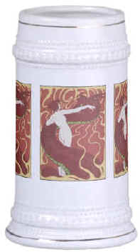 | Hans Christiansen (b. Flensburg 1866 - d. Wiesbaden 1945) was a very important and "true to the name" Jugendstil artist as attested by his having designed numerous Jugend magazine covers and provided articles as well. He worked in all mediums from ceramics to leather and did paintings and posters similar to those of Toulouse Lautrec. Although some of his designs were used by Villeroy & Boch at Mettlach (and possibly other V&B factories), we can't find evidence at this point for any steins using his designs except the one shown here. | |