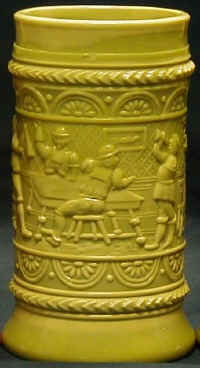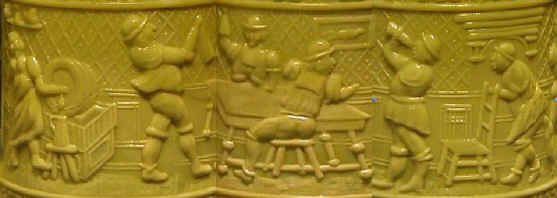 ![]() This month's stein features the Indoor Drinking pattern (shown above, unrolled) which is entwined with one continuous scene depicting the inside of a tavern where a barmaid draws beer from a large barrel and a group of six men toast each other and drink from their steins. The stein is the Nile Green color, standing 8 inches tall and displaying the intricate relief work found on these steins. Other colors for this pattern are Clear and Chocolate Opaque, and other sizes are 5 and 5.5 inches tall. Some of these steins are found with a pouring lip. There is also a tumbler in this pattern (referred to as a handleless mug). You can read more about Greentown Glass Steins, the Serenade and Outdoor Drinking patterns, and the Westmoreland pieces in the September 2013 issue of Prosit. |