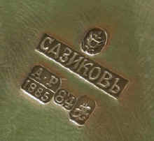 ![]() During the Sazikov firm's long existence, its productions included high quality silverware, as well as cast-silver sculpture and silver decorated with cloisonné enamels. A Google search of the firm's name today will indicate the magnitude of the firm's output. | ||