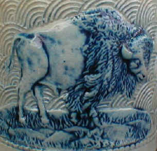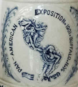 We are going to Shuffle Off To Buffalo for this month’s Featured Stein. This song is from the 1933 Broadway musical 42nd Street. It should be playing in the background if you have your speakers turned on. These steins were made by White’s Pottery Inc. of Utica, NY. The firm was founded by Noah White circa 1834. Stein production did not commence until 1885; stoneware production ceased circa 1907. These steins were made to be sold at the 1901 Pan-American Exposition held in Buffalo, NY. One stein shows the official emblem of the exposition on one side, and the other shows a buffalo. Vendors had to pay a license fee for the official emblem, which is why the buffalo, an appropriate symbol for the host city, was a popular substitute souvenir. The official emblem is quite clever as two women in billowing skirts form North and South America with their joined hands forming Central America. The emblem was designed by Buffalo artist Raphael Beck (1859-1947). ![]()