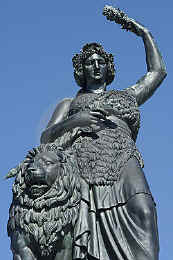 The stein was made by Martin Pauson for the Wagnerbräu brewery for the 1902 Octoberfest in Munich. The Octoberfest is held in a large field called the Thereseinwiese, Thresea's meadow. Overlooking the field is the Ruhmeshalle, hall of fame, and a very large ( over 60 feet tall ) statue of Bavaria and her lion, who are symbols of the state of Bavaria. The scene on the stein humorously depicts Bavaria and her lion having come down from their perch on the pedestal after the fest had closed and taking advantage of undrunken beer left by departed revelers. The brewery's trademark on the lid may have been a major factor in driving up the price on this stein, but somehow I feel the scene on the stein may also have had some influence. You can read more about this stein and Bavaria in articles by Stewart Eastman and Walt Vogdes in the March 2008 issue of Prosit. |