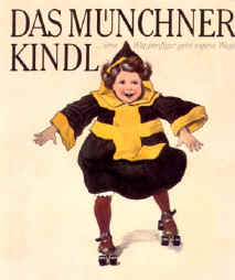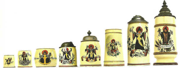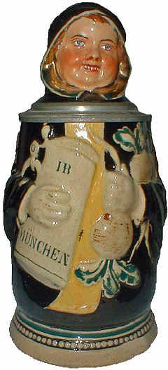 ![]() I had always thought that "das Münchner Kindl" was the term used for the mascot of the city of Munich as shown on a whole host of steins commemorating Munich. One maker, Dorfner of Hirschau, has produced steins with the Münchner Kindl designs, ca. 1900, in many different sizes (see picture below). The smallest of these are called Kinderkrüge (children's steins) and were given to children for special occasions like birthdays, name days, confirmations or just for being a good kid. The mid sized steins, 0.5 to 1 liter, are called "Trinkkrüge" (drinking steins) and were used for drinking at home or at the pub. Larger steins are called "Bringkrüge" (bringing steins) or "Holkrüge" (fetching steins) not shown here and were in the 2 liter and larger sizes used to take to the local brewery or tavern to fill with beer to be brought home and stored for very short periods and served from. Recently it has come to my attention that the "Münchener Kindl" has evolved thru the years into a more mature "Münchner Mädl" (Munich Maid). The terms "Kindl" (remember going to Kindergarten = children's garden) and Mädl (Bavarian dialect), "Mädel" or "Mädchen" ![]() Mädchen" mentioned once on its 292 pages. ![]() Many of the Münchner Kindl steins made by Dorfner of Hirschau. For more info on steins from Amberg/Hirschau, see: Prosit, March 2014. Also search Chris Wheeler's "Stein Marks" website for "Dorfner" of Hirschau and "E. Kick" of Amberg. Compliments of Erste Gruppe |