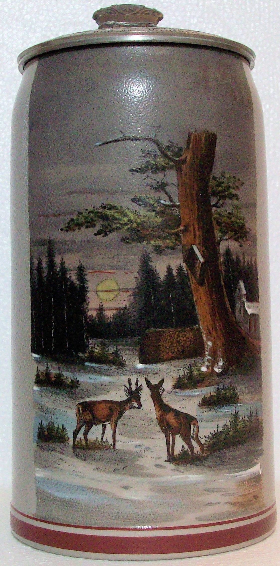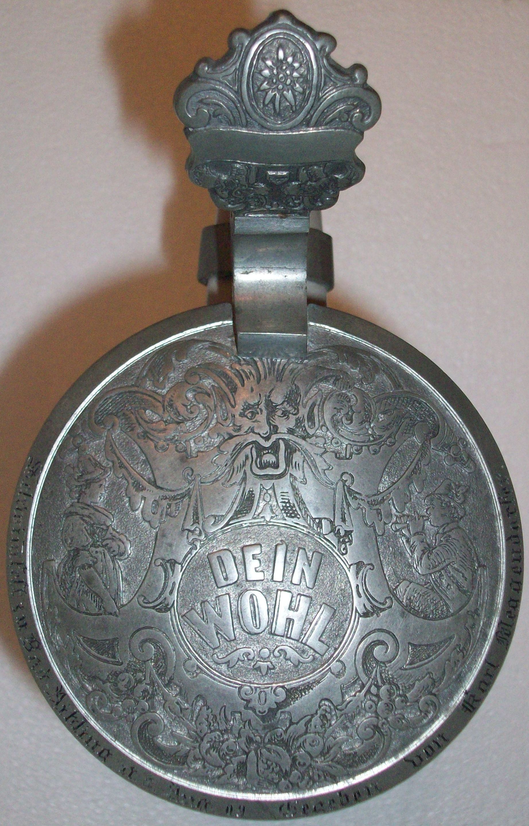 This month’s stein provides a bucolic setting as an introduction to the hectic times to come. The hand-painted scene shows a rising moon shining on what may be the first snow of the season, a pair of roe deer observe their surroundings, a chapel is in the distance, and a Feldkreuz, or field cross, is attached to a tree. We may wish to remember quiet times like this in the weeks ahead. The lid has a very detailed engraving surrounding the traditional toast, Dein Wohl, To You! A dedication engraved around the rim of the lid shows the stein was presented to Karl Meggendorfer at a swim-meet at Bad Aibling on 8 August 1909. Unfortunately, the stein has no markings to indicate the maker, decorator or pewterer.