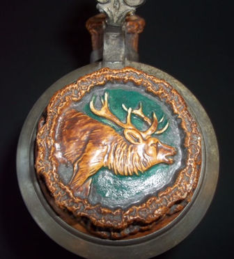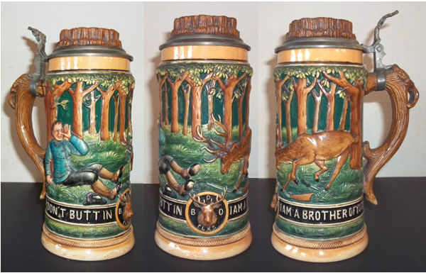The text on the first reads "Don't butt in I am a brother of yours". It has a matching lid insert depicting an elk, although it's usually seen with a plain conical pewter lid. The handle is one I've seen nowhere else. |