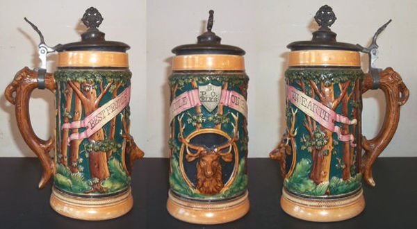 The text on the second stein reads "Best people on earth". The lid is a replacement, soldered to the original thumblift, it appears to be pot metal rather than pewter. Both steins have the same handle. Both hold unusual capacities, the first about .9 liter and the second about .75 liter. Neither have any markings other than Germany on the bottoms. My guess is that they are JW Remy's. |