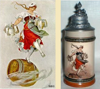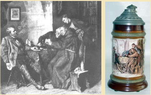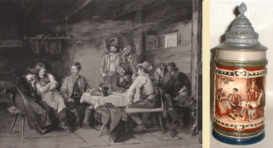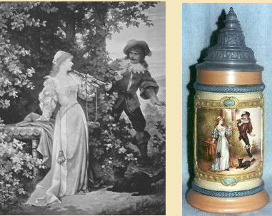 ![]() Carl Schweninger Jr., 1854-1903: "The Surprise" is one of 10 lithographs produced in 1887 and 1888 to illustrate "Der Trompeter of Säkkingen" written in 1855 by Jos.Victor von Scheffel.This poem has been a favorite source of decorations on steins, and a wide variety of scenes are well known. |