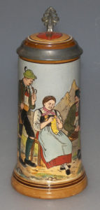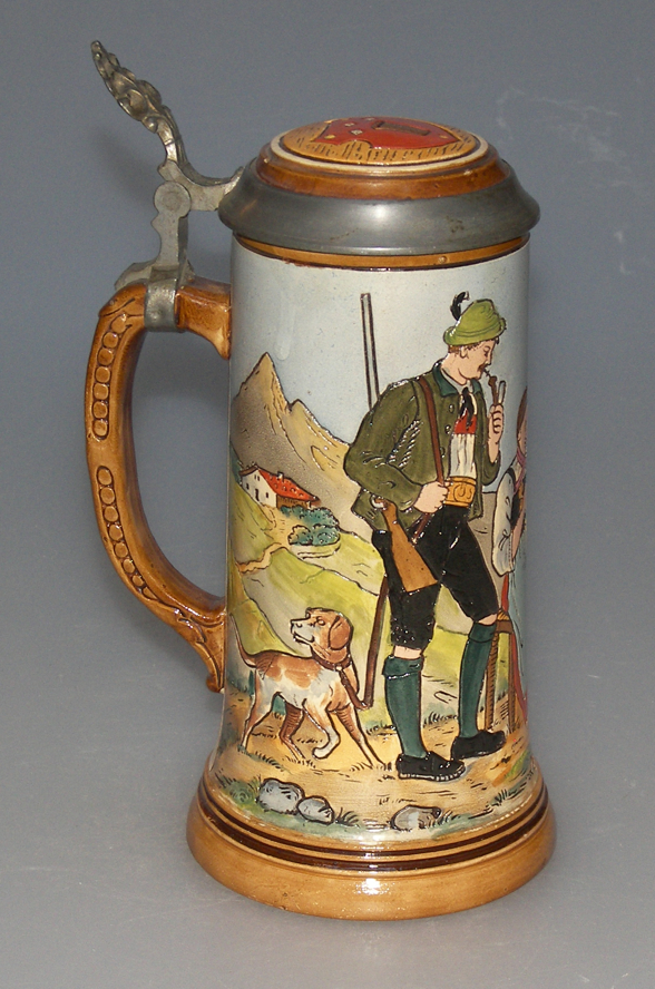 | This etched stein, No. 1755, was designed by Rudy Dekker and produced by the firm of Reinhold Hanke. It depicts a peaceful mountain scene: at left, a Jäger (hunter) with his rifle slung over his shoulder and his dog at his side; in the center a seated woman is knitting; and at right, a second man sits next to the woman, holding a stein of beer in his lap. Further to the right, next to the handle, is a snippet of German wisdom: | ||