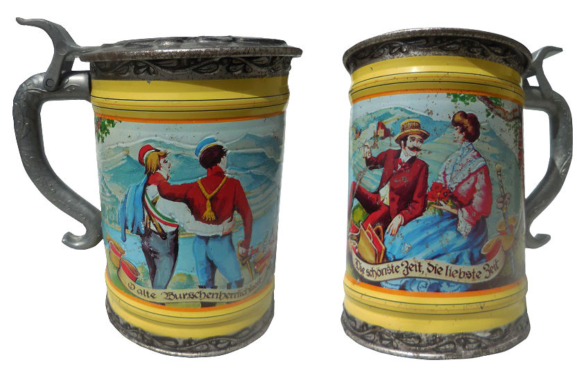 The theme expressed in the scenes and verses on this stein is that of a fond reminiscence of youth and student days. The verse on the left of the stein is from an old student song O Alte Burschenherrlichkeit, first published anonymously in the Berlin journal The Free-thinker on August 9, 1825. The first two lines of the song are shown below:
