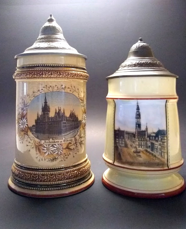 I have a Mennonite family heritage from Prussia, and have sought steins from that region for many years. The cities of Elbing and Danzig were the two largest areas of substantial Mennonite settlement during the 1600-1700’s. I have had a tourist type stein from Elbing for some time, and was thrilled when I was able to purchase a stein from the city of Danzig. The pottery stein from Elbing is at left in the photo, while the porcelain stein at right is from Danzig.