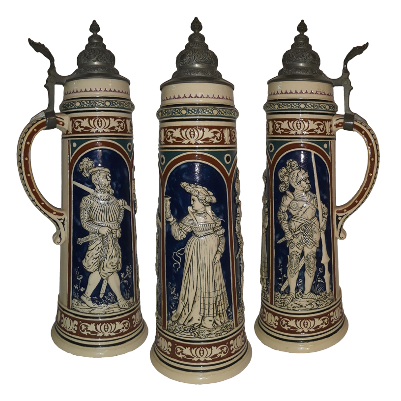 The stein is two-liter pottery relief with a pewter lid. It features characters that reflect portrait sitters of Hans Holbein the Younger, members from British high class, and his Northern Renaissance style portraits from the 16th century. Hans’ most famous work is arguably a portrait of King Henry VIII, credited for creating the standard image of King Henry VIII.
