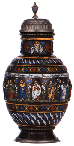 In 2014 I picked up a 1.5 liter reproduction Creussen Apostleskrug. It carried on its base the mark of the Fischer/Bamberg Company, a company that made various ceramic wares, including a small production of beer steins in the 1950s. It's a nicely done and authentic looking piece and I'm pleased to have it in my collection.