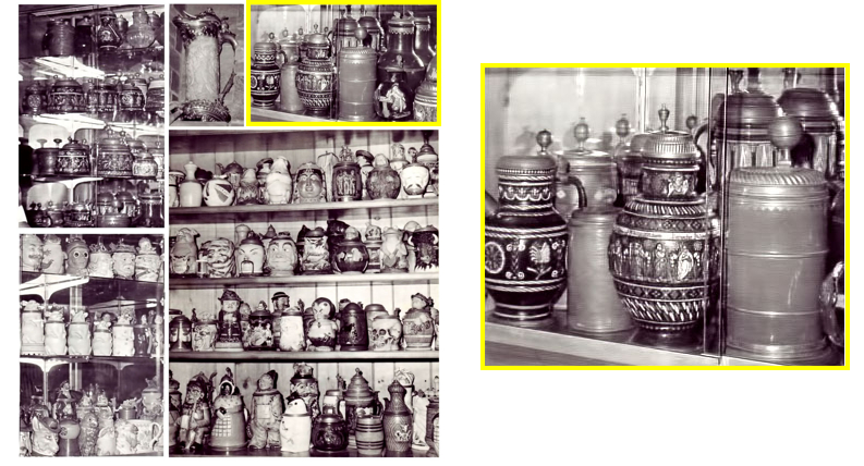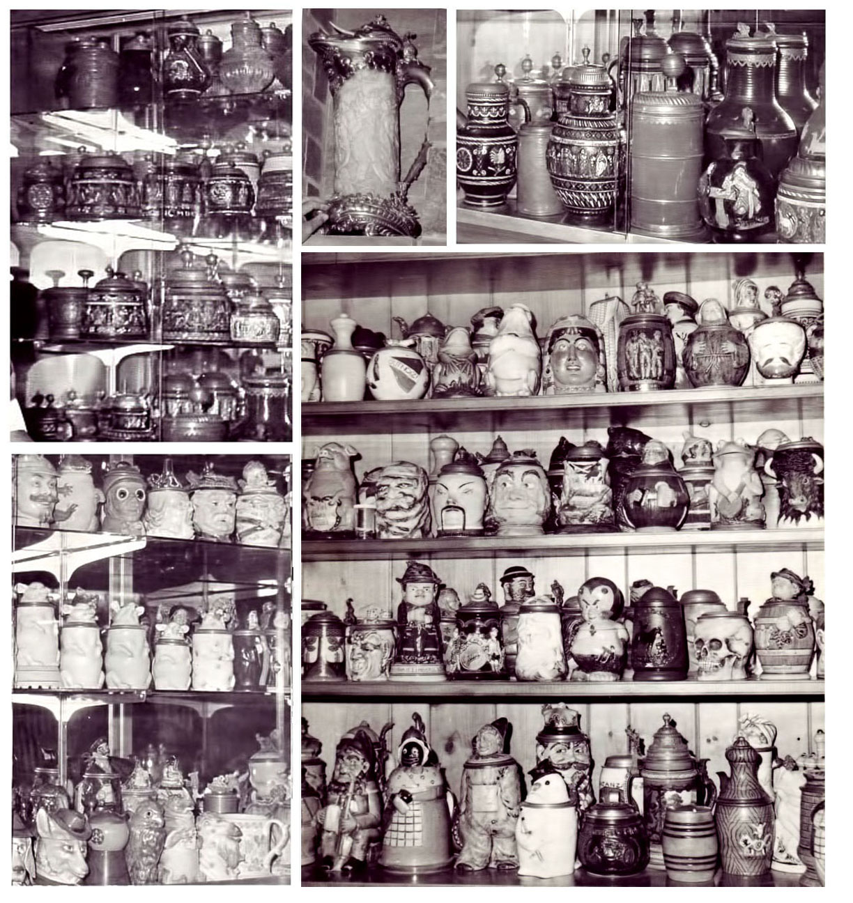 Featured in that first Prosit-named issue was a gentleman named Bill Schwartz. Bill had a collection of over 4,000 steins and had recently been awarded a plaque honoring him as the "Dean of Stein Collectors" at a special SCI banquet that had been held in his honor. The feature story described how and why he got into stein collecting and had many photos showing some of his extensive collection. Although these photos are only the proverbial tip of the iceberg that was Mr. Schwartz' collection, they are certainly enough to show that it was a very fine collection indeed and that Mr. Schwartz had some very old high-end museum-quality pieces in it.