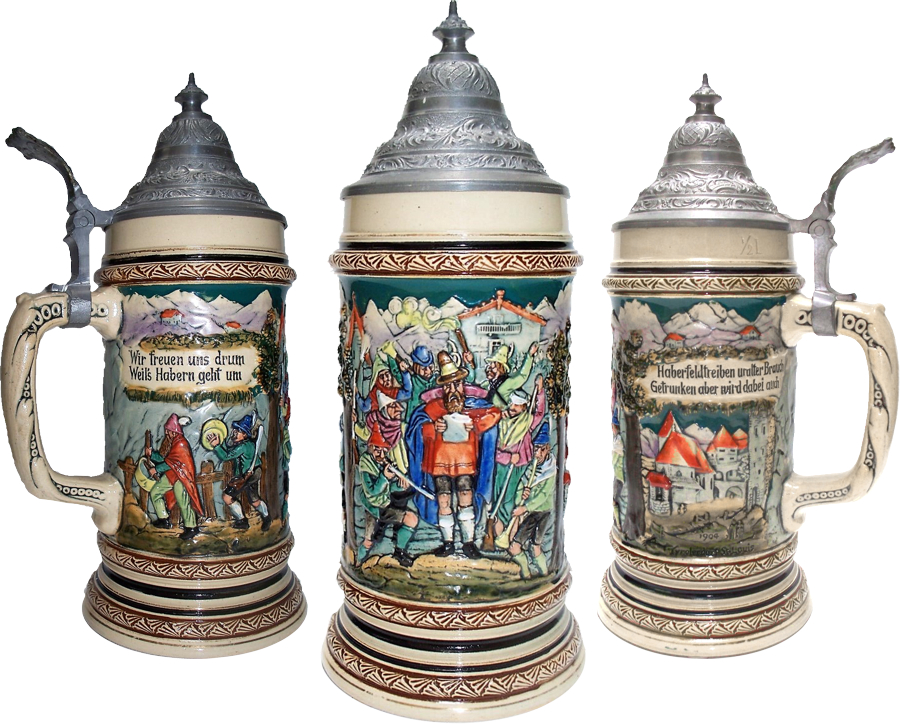 I recently became aware of an article in the September 2010 issue of Prosit which explains the term Haberfeldtreiben. This was an early 18th century practice of shaming someone who had committed an act which offended the local citizenry. A band of people would gather outside the perpetrator's house in costume, bearing guns and musical instruments. The ensuing ruckus drew attention to his poor behavior, causing him shame and embarrassment. The word Haberfeldtreiben is difficult to translate, but Habfereld is an oatfield, and treiben means "drive," so in a literal sense the person was "driven into the oat field." Although the original intent of this practice seems totally incongruous with the World's Fair, by the time this stein was made the tradition had apparently evolved to an excuse for raucous drinking! That sentiment we can understand!