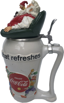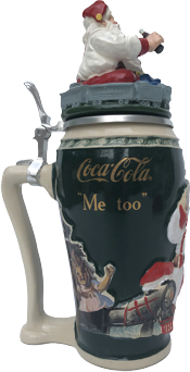 Sundblom painting entitled "Me too." The stein depicts Santa sitting