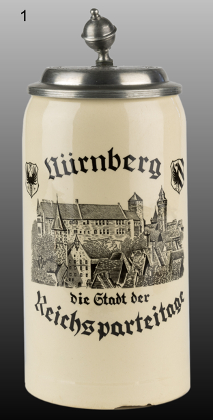 The ageless aphorism attributed to George Santayana in 1905 "Those who cannot remember the past are doomed to repeat it." is echoing again as the spector of a possible WW III rises. In this regard it seems appropriate to visit a beer stein (fig. 1) that appeared without change thru the period 1927 to 1939, presaging WW II and the Holocaust. These steins were ordered without lids by the firm of L. Ostermayr in Nürnberg to be produced and decorated by Villeroy & Boch at Mettlach with the Ostermayr logo printed or incised on the base (see: Stein Marks). These steins were souvenirs made and sold as business arrangements and did not necessarily reflect the political views of the purveyors. The Reichsparteitage (German Government Conventions) of the Weimar Republic were moved to Nürnberg in 1927 because it was a historic and venerated German city, and they continued there thru 1938.