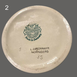 The examples that we know of have been found dating from the time of the occupation of the Saarland after WW I (1927 to 1933) marked "Made in Saar-Basin," and after restitution of the Saarland to Germany (1935 to 1939) marked "Made in Germany". One of the more interesting things indicated by that mark is that these steins were made also for the English speaking world. The Reichsparteitag of 1938 became the last when the expected 1939 event was cancelled due to concentration on the Anschluß (Nazi accessions), probably leaving Ostermayr with some unsold steins. It was the stein dated 1935 (fig. 2) that was of most interest.