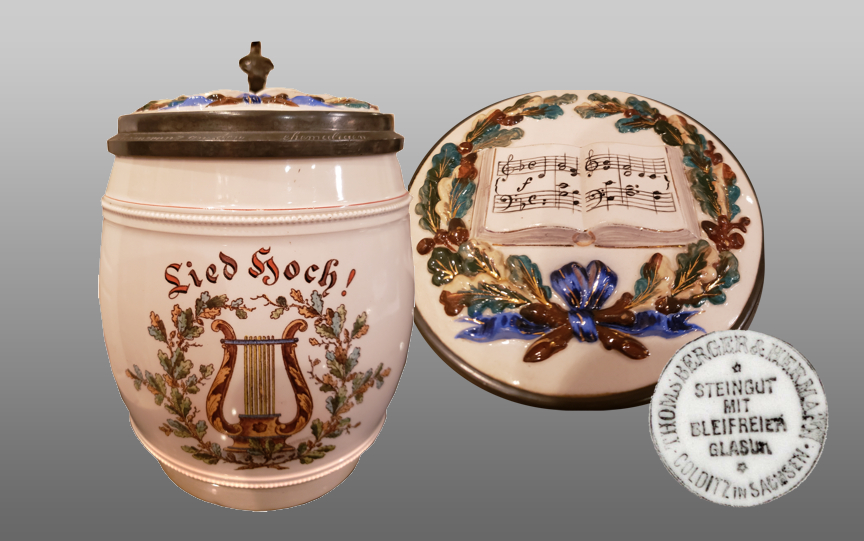 I was recently able to acquire this interesting two liter pottery musical stein while at Steinfest this year. It is from an uncommon factory,,, Thomsberger & Hermann of Colditz, Saxony with their mark clearly on the bottom of the stein. The Thomsberger & Hermann Company moved from Wermsdorf to Colditz in 1804 and produced high quality crockery in Badergasse until 1929. They first produced stoneware and then porcelain. Colditz was an important source of kaolin delivered to Dresden and later Meissen for the creation of porcelain in Europe.