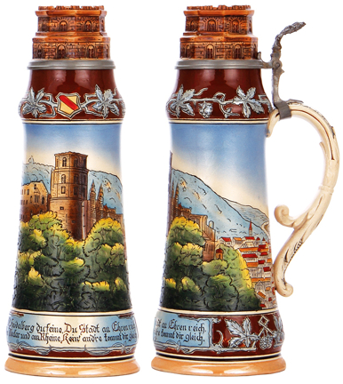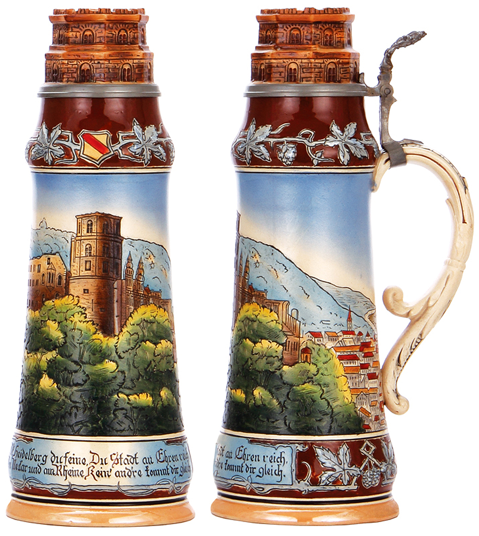 I have in my collection several steins made by Matthias Girmscheid, some decorated in relief, some etched. My favorite among these by far is the Catalog Number 814 Heidelberg stein.It is an etched beauty with an inlaid figural castle-tower lid standing a stately 14.75 inches tall. It has a capacity of 2-liters. Its principal decoration features the magnificent Heidelberg castle atop its hilltop overlooking the city of Heidelberg. Above this appear the arms of Baden, a shield with a red band traversing a field of gold, from upper-left to the lower-right, or "Or a Bend Gules" in heraldic terms.