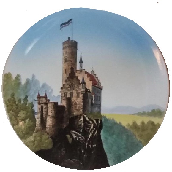My interest in this stein is not in its peculiar design nor its association with the German student associations whose steins I collect, but by the castle (Schloss Lichtenstein) on the lid, which I visited on a 3rd grade field trip in 1953. The castle, situated on top of a large rock formation and accessible only by a drawbridge made quite an impression on my youthful mind. The castle is located about 20 miles southeast of Tübingen and has been described as the "fairy tale castle of Württemberg." The modern castle was inspired by the novel Lichtenstein (1826) by Wilhelm Hauff and was built in 1840–1842. The ruins of the medieval castle that inspired the novel are a few hundred meters away. The name Lichtenstein translates as "shining stone”.