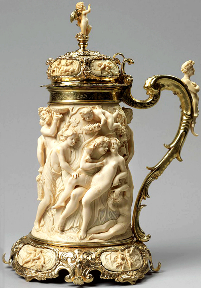 The magnificent C1640 ivory and gilt silver tankard shown on the right is part of the Habsburg Imperial Collection of the Kunsthistorisches Museum in Vienna, Austria.