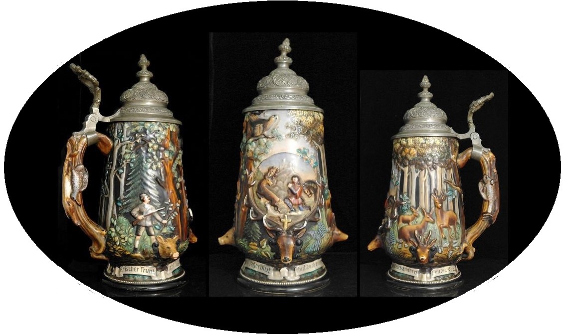 The character and story of St. Hubertus is very popular. Depictions of Hubert and his vision can be found on over a dozen steins in the Beer Stein Library and on over two dozen paintings on the Internet.