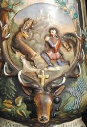 This month's stein is a pottery relief stein by Reinhold Hanke, #1274. The central image on this stein depicts the kneeling figure of St. Hubertus, patron saint of hunters among French and German-speaking peoples of Europe. The crucifix between the antlers of a stag symbolizes the vision that appeared to him at the moment of his epiphany.